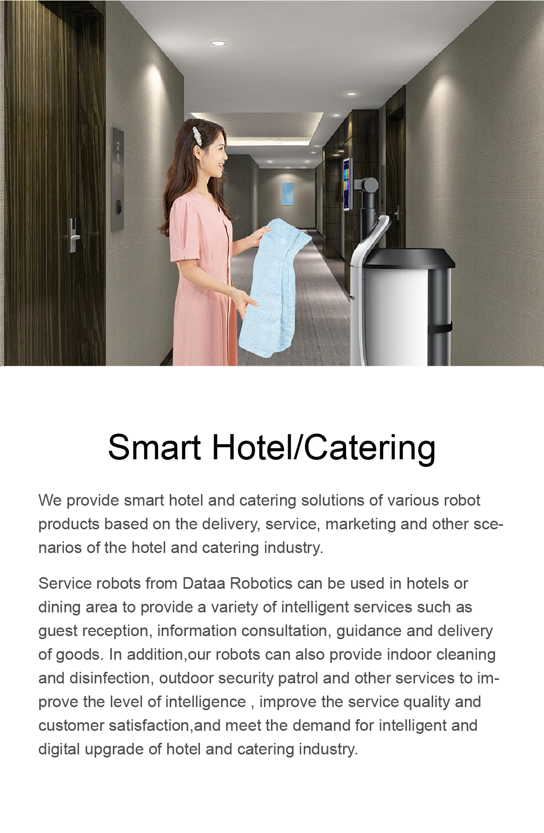 We provide smart hotel and catering solutions of various robot products based on the delivery,