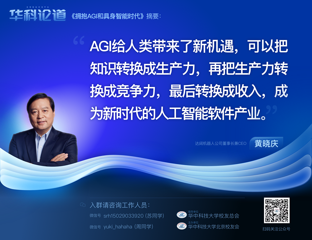 作為華中科技大學(xué)傑出校友及全球人工智能領(lǐng)域的前沿技術(shù)專家,黃曉慶先生結(jié)合自己多年在機器人行業(yè)的深入研究和實踐經(jīng)驗,分享了對於通用人工智能(AGI)發(fā)展趨勢及其對各行各業(yè)影響的洞見。他認為,AGI將成為新時代軟件產(chǎn)業(yè)轉(zhuǎn)化知識、生產(chǎn)力、競爭力乃至收入的關(guān)鍵驅(qū)動力,以下是他的主要觀點和演講中的「金句」: