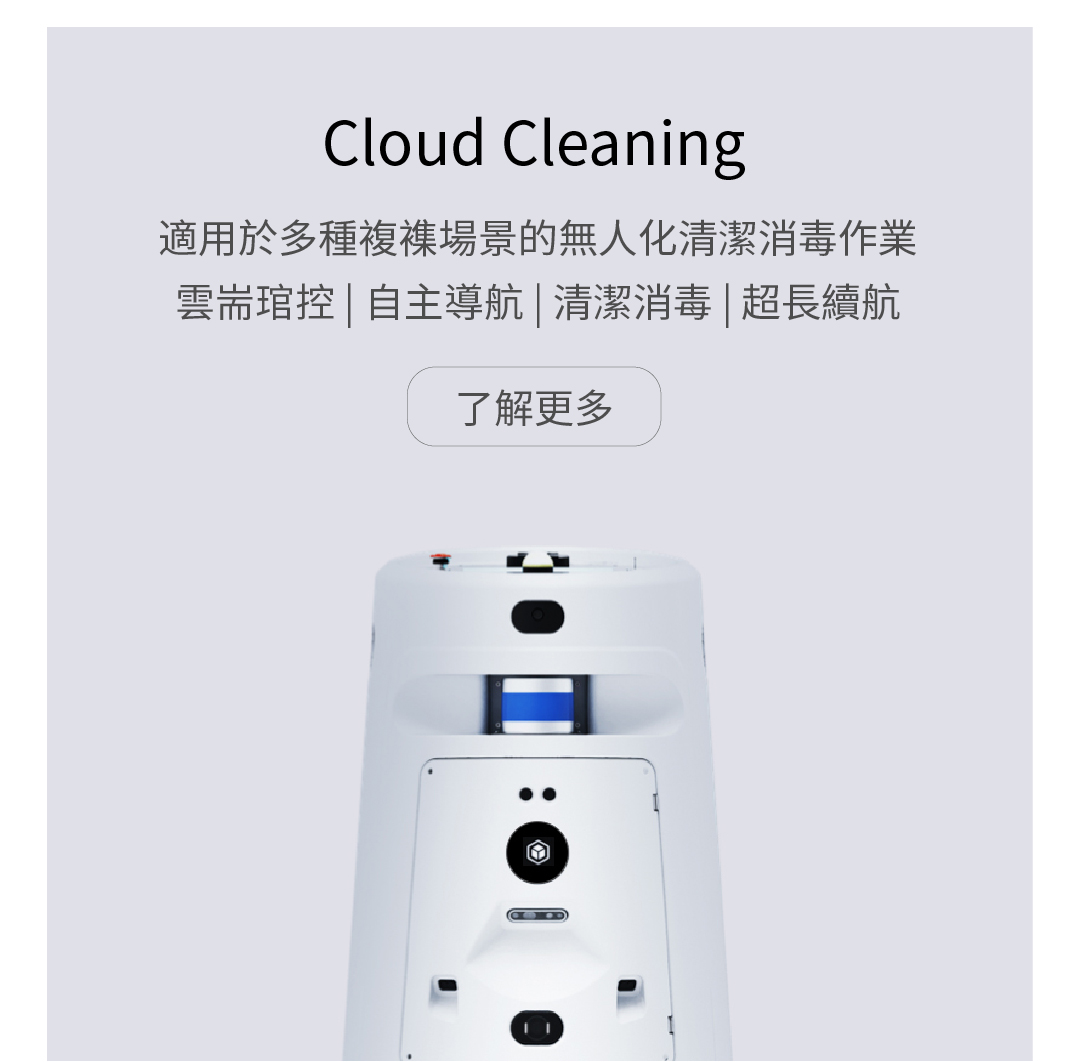 適用於多種複襍場景的無人化清潔消毒作業(yè) 雲(yún)耑琯控 | 自主導航 | 清潔消毒 | 超長續(xù)航 了解更多