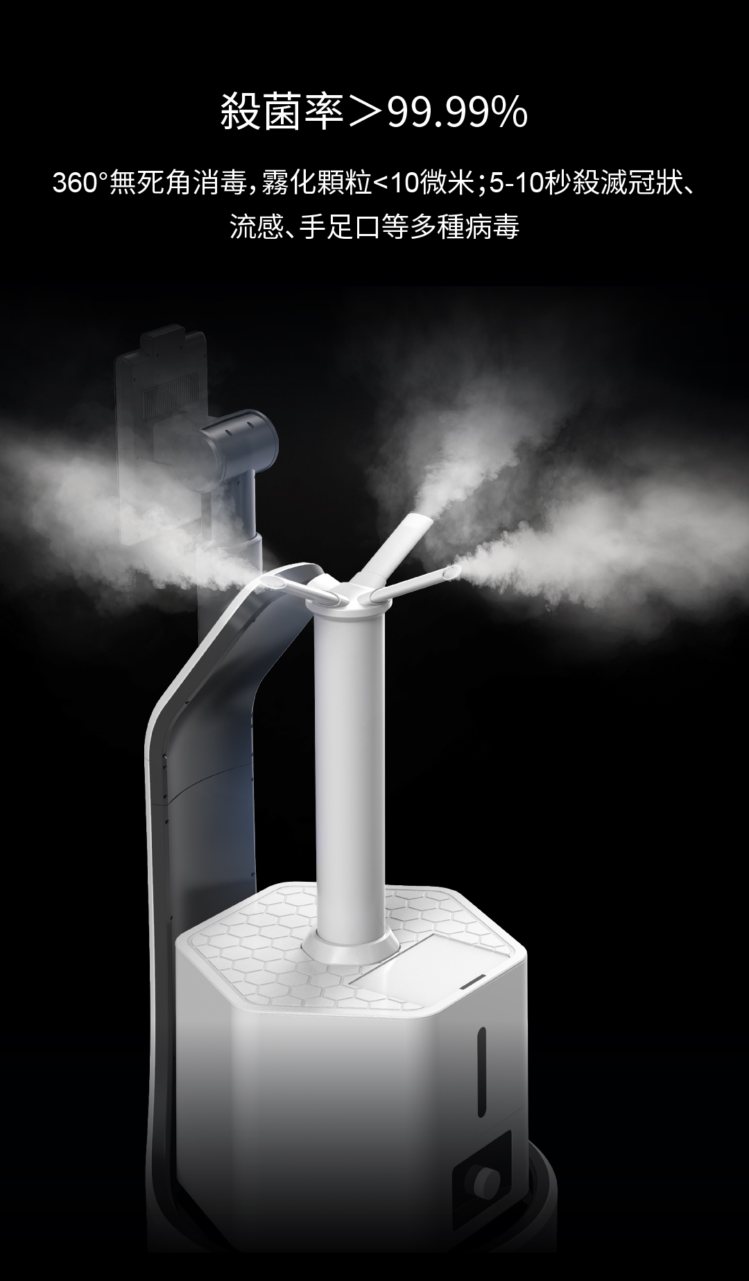 360°無死角消毒,霧化顆粒<10微米;5-10秒殺滅冠狀、流感、手足口等多種病毒