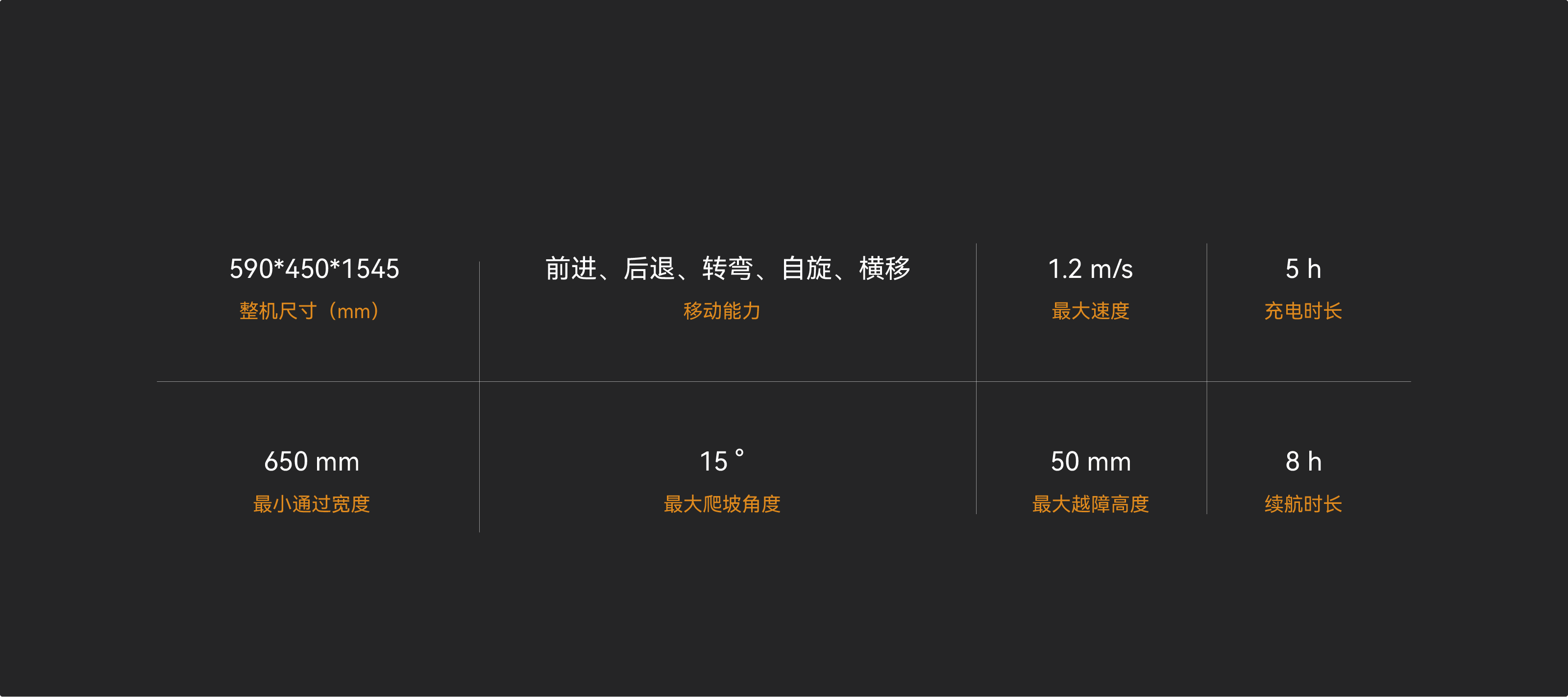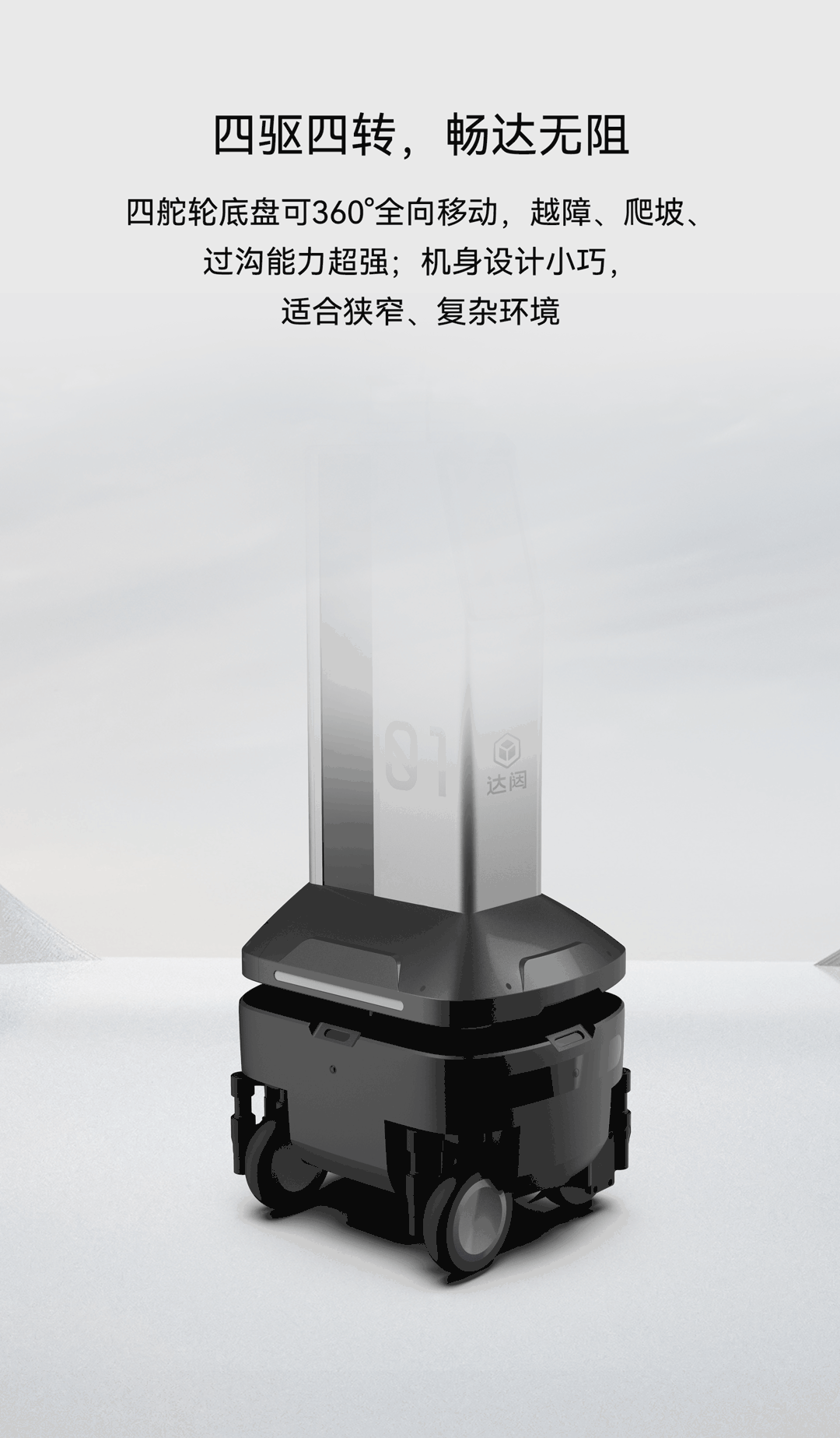 四舵輪底盤可360°全向移動,越障、爬坡、過溝能力超強;機身設計小巧,適合狹窄、復雜環境