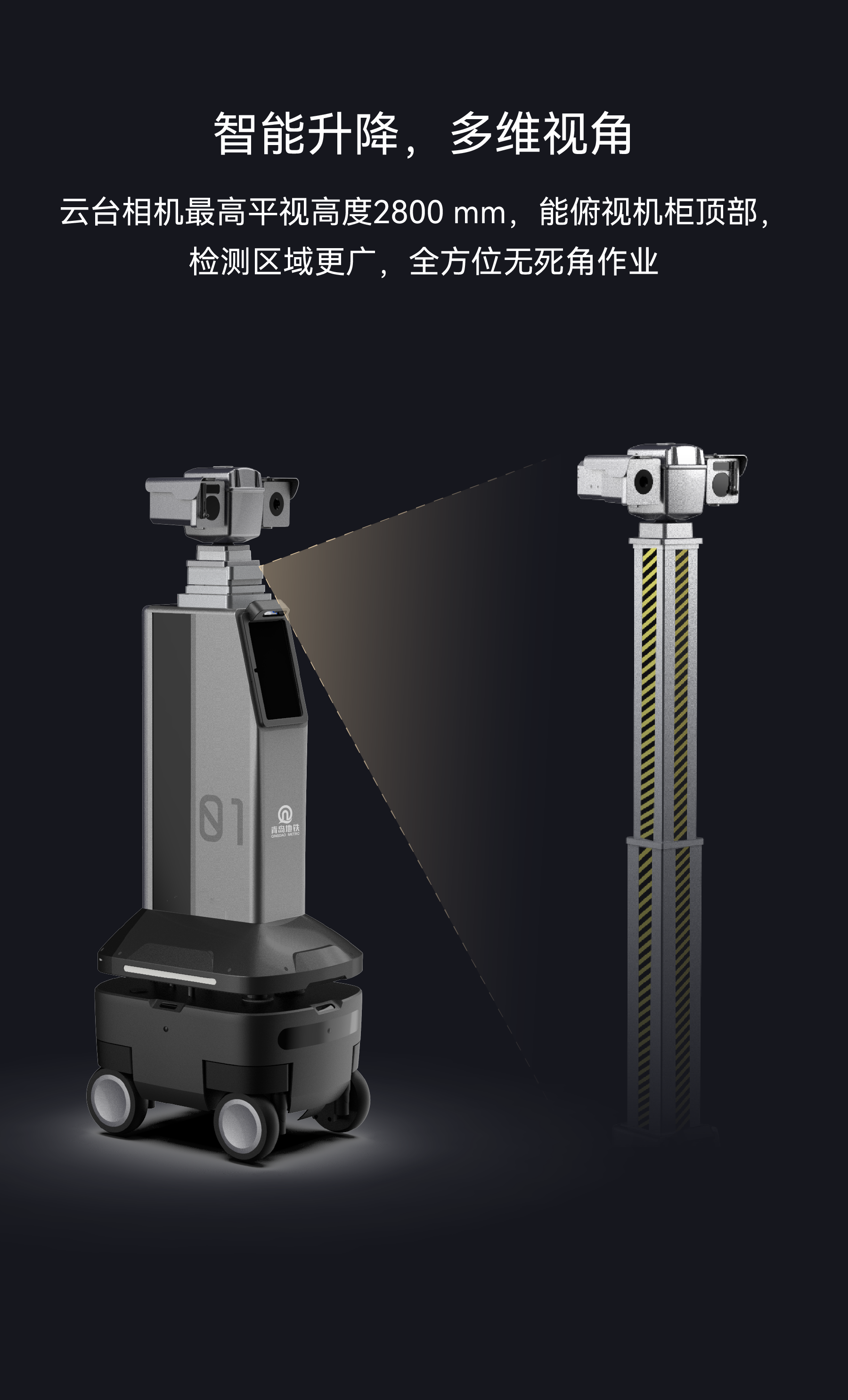 云臺相機最高平視高度2800 mm,能俯視機柜頂部,檢測區域更廣,全方位無死角作業