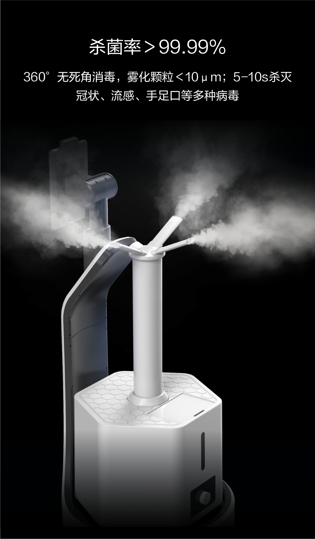 360°無死角消毒,霧化顆粒<10μm;5-10s殺滅冠狀、流感、手足口等多種病毒