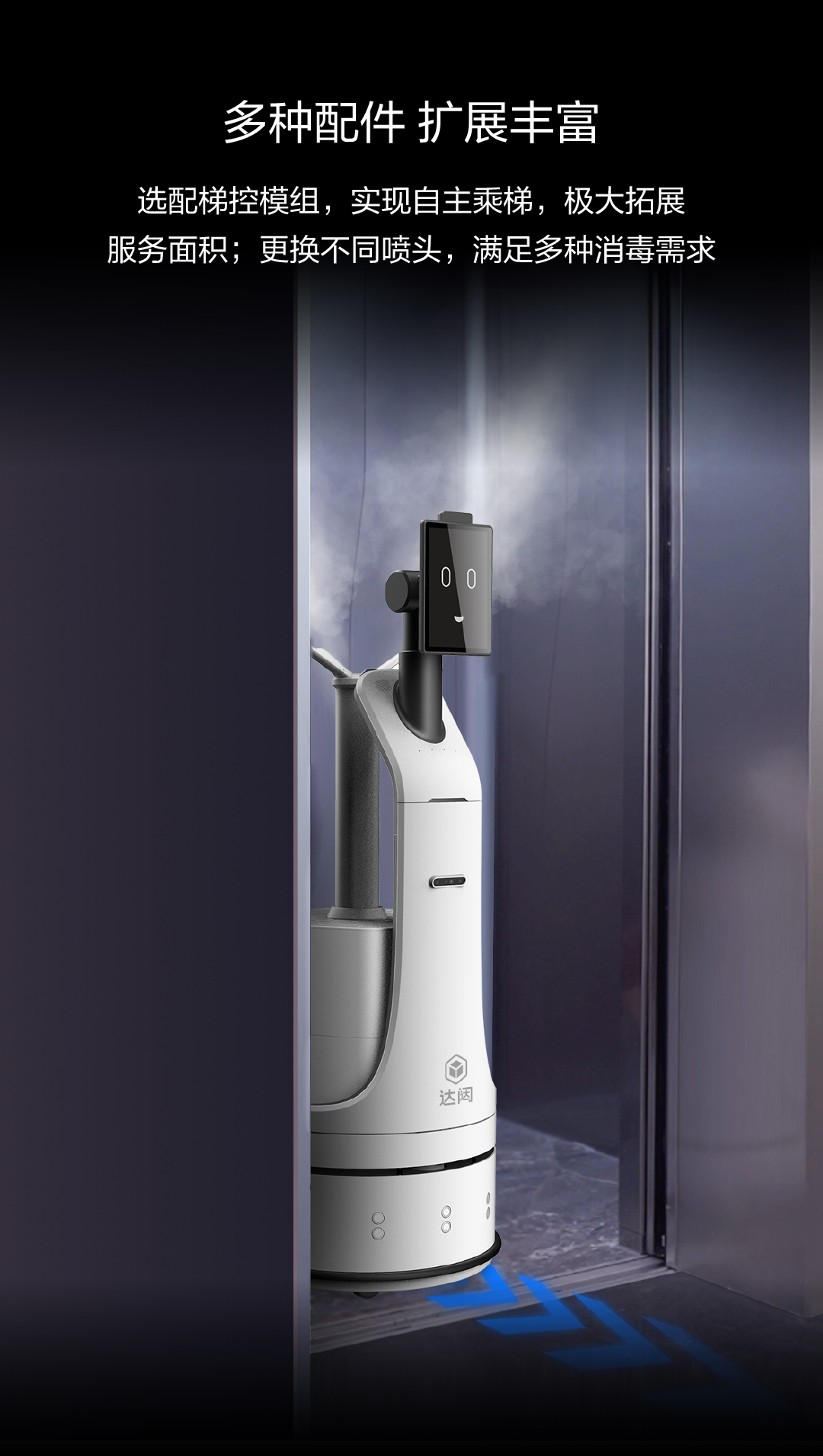 選配閘機、梯控模組,實現自主過閘機、自主乘梯等功能,極大拓展服務面積;更可更換不同霧化噴頭,滿足多樣消毒需求