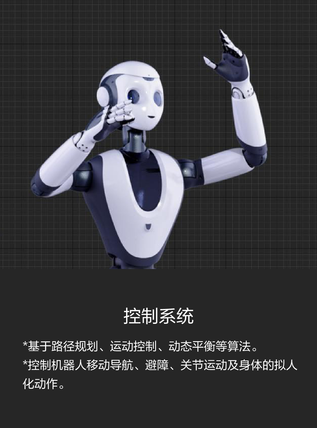 *控制機器人移動導航、避障、關節(jié)運動及身體的擬人化動作。